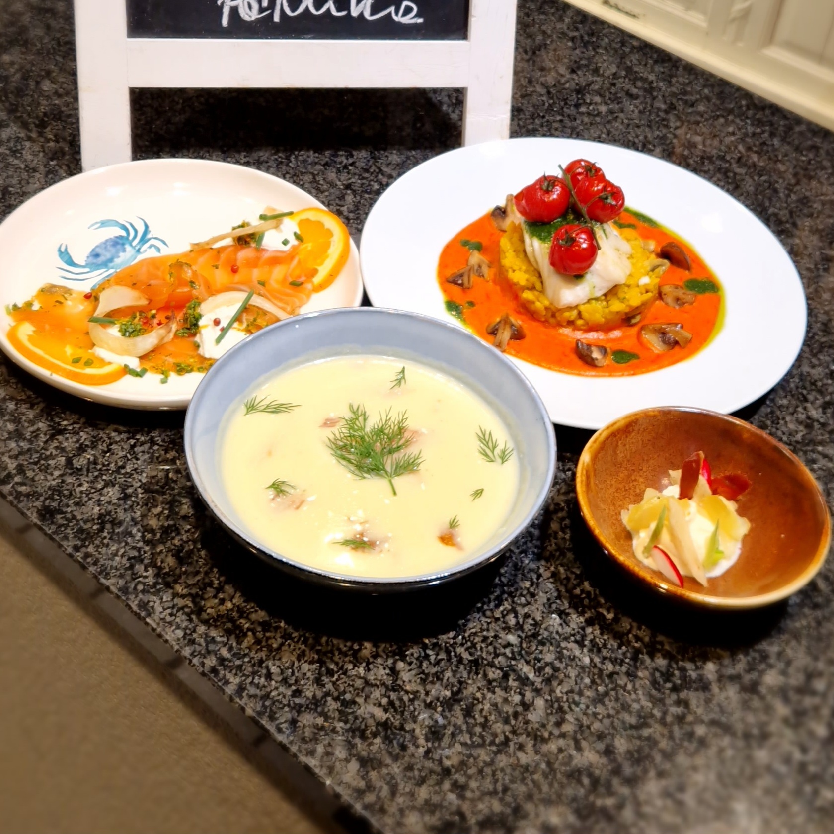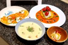 Komkommersoep met roomkaas en gerookte forel